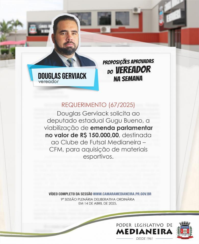O vereador Douglas Gerviack solicita ao deputado estadual Gugu Bueno, a viabilização de R$ 150.000,00, destinada ao Clube de Futsal Medianeira, para aquisição de materiais esportivos.