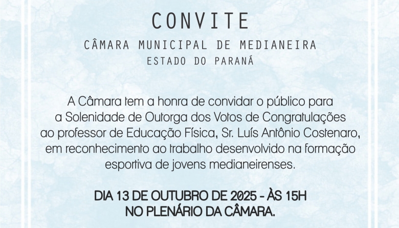 A Câmara Municipal de Medianeira convida toda a comunidade para a Solenidade de Outorga dos Votos de Congratulações ao professor Luís Antônio Costenaro, em reconhecimento ao trabalho dedicado à formação esportiva dos jovens medianeirenses.
