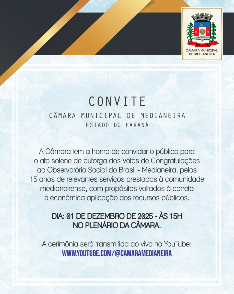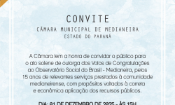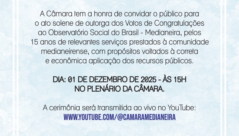 A Câmara realizará, no dia 1º de dezembro de 2025, às 15h, o ato de outorga dos Votos de Congratulações ao Observatório Social do Brasil – Medianeira. A homenagem celebra os 15 anos de relevantes serviços prestados à comunidade medianeirense, com destaque para o compromisso da entidade com a correta e econômica aplicação dos recursos públicos.