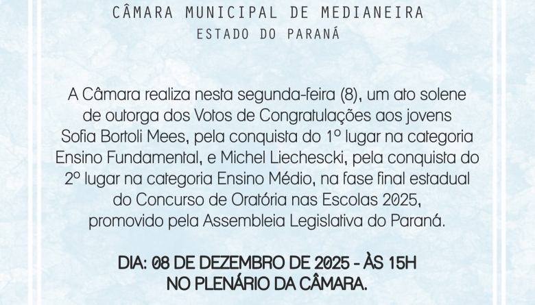 A Câmara homenageará nesta segunda-feira (8) os jovens Sofia Bortoli Mees e Michel Liechescki pelos excelentes resultados na fase final estadual do Concurso de Oratória nas Escolas 2025, promovido pela Assembleia Legislativa do Paraná.