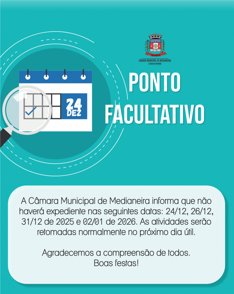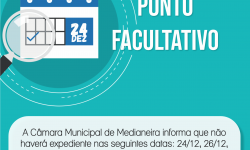 A Câmara Municipal de Medianeira informa que não haverá expediente nas seguintes datas: