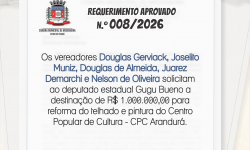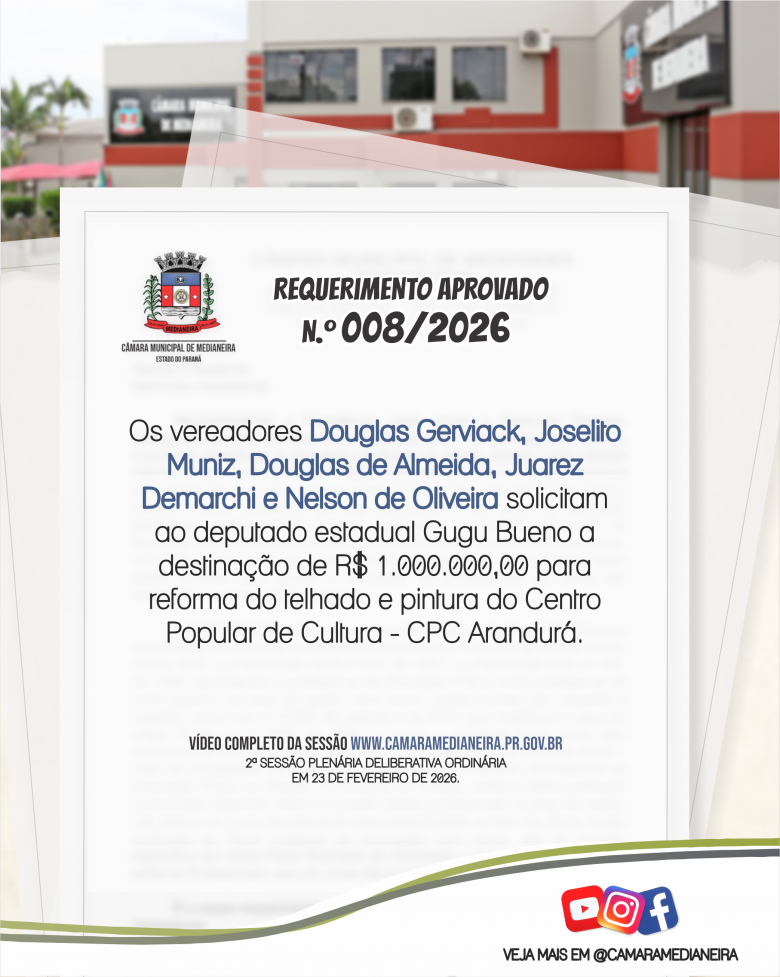 Requerimentos de autoria dos vereadores aprovados nesta semana. Para mais informações acesse o site. www.camaramedianeira.pr.gov.br