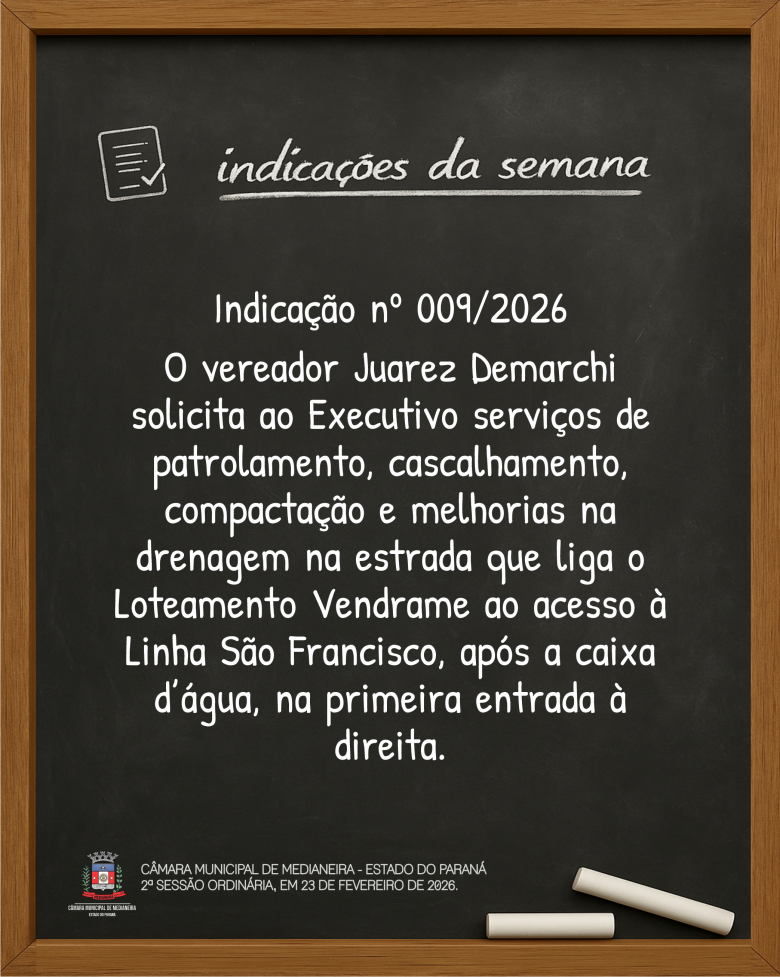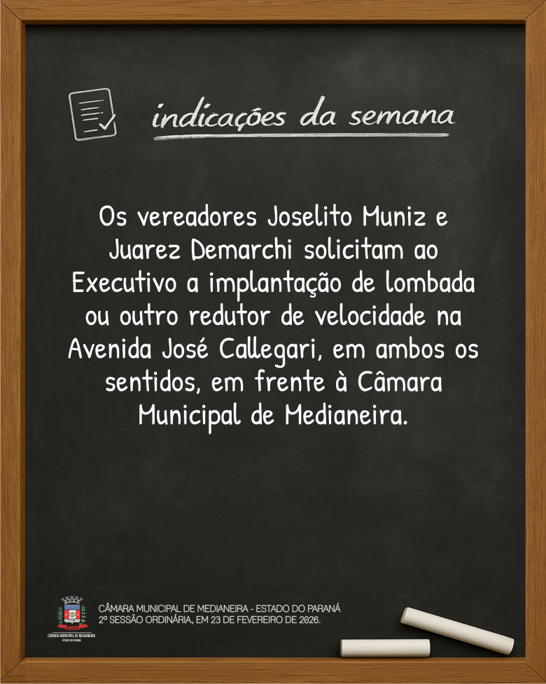 Indicações da 2ª Sessão Ordinária, de 23 de fevereiro de 2026. Mais detalhes sobre a sessão no site www.camaramedianeira.pr.gov.br.