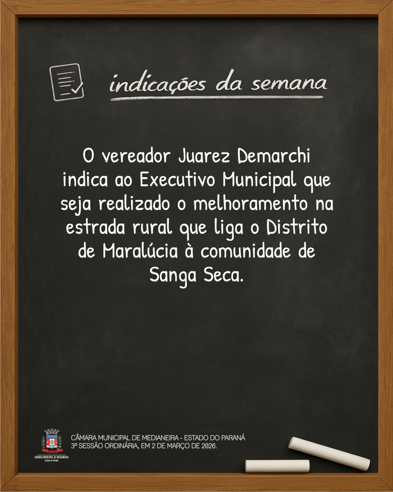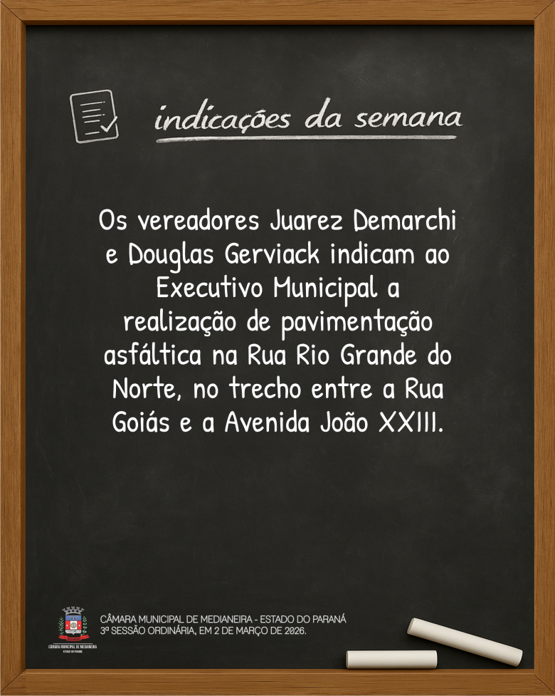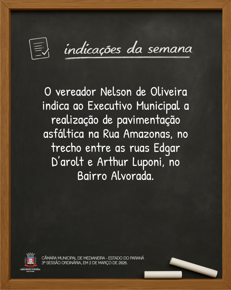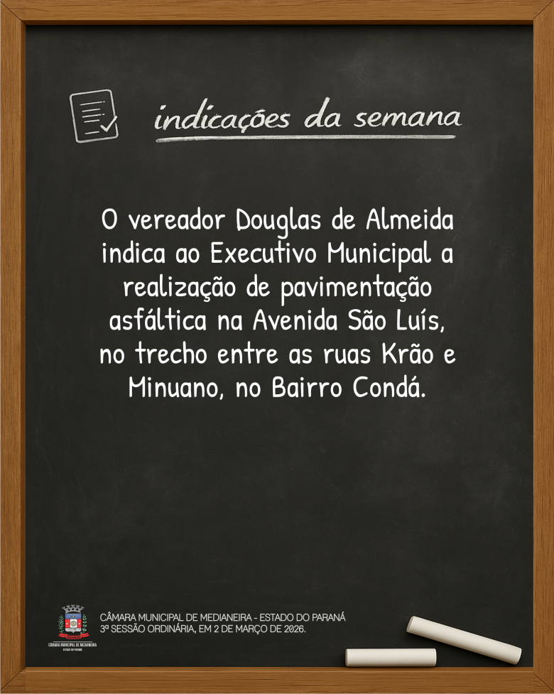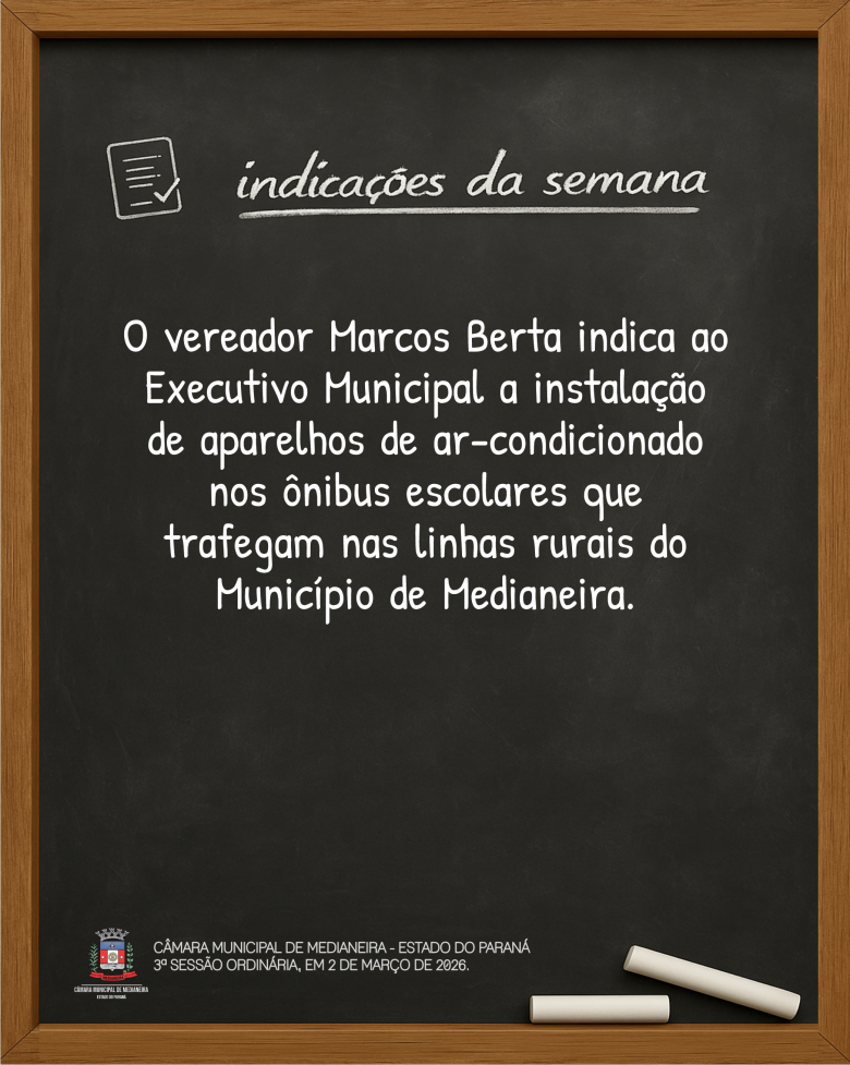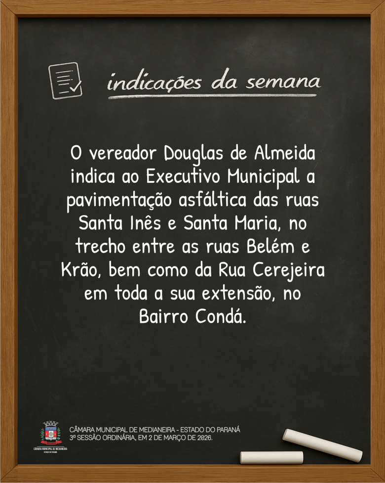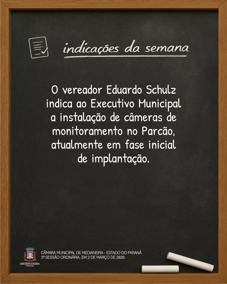 Indicações da 3ª Sessão Ordinária, de 2 de março de 2026. Mais detalhes sobre a sessão no site www.camaramedianeira.pr.gov.br.
