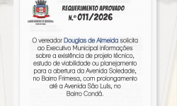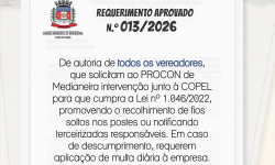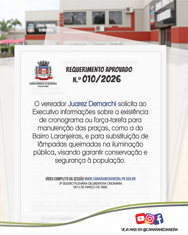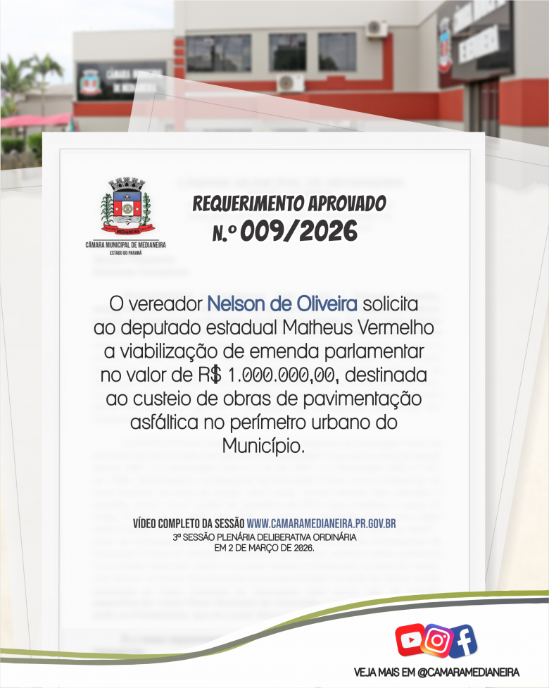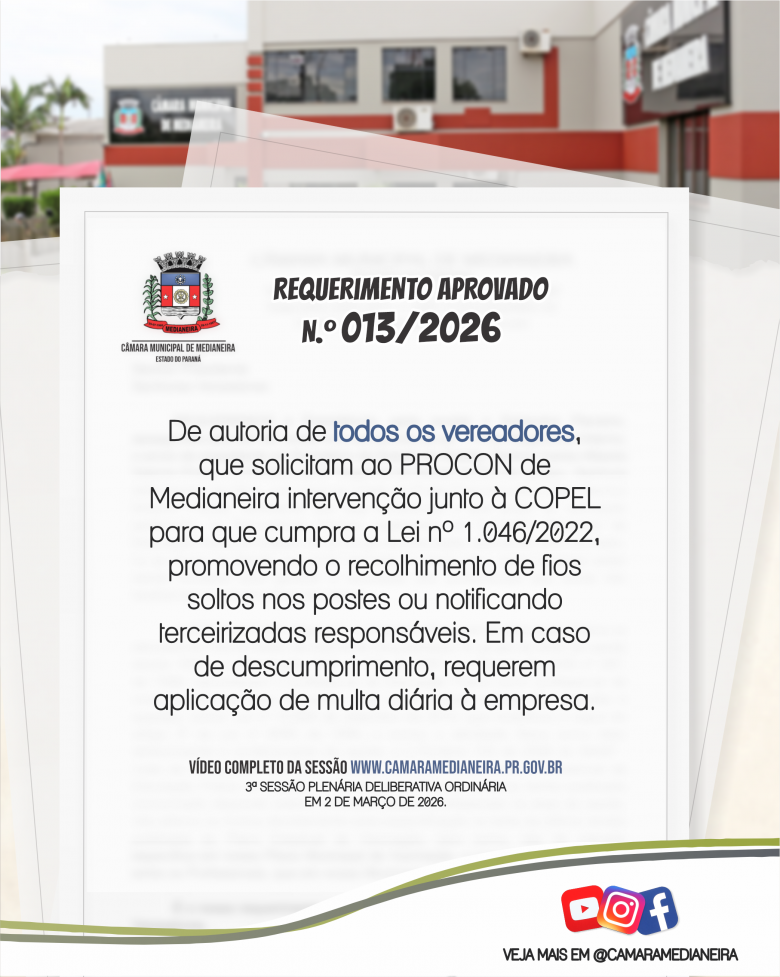 Requerimentos de autoria dos vereadores aprovados nesta semana. Para mais informações acesse o site. www.camaramedianeira.pr.gov.br