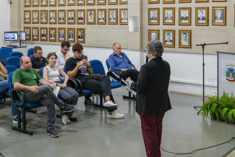A secretária de Desenvolvimento Econômico, Márcia Hanzen, esteve no plenário da Câmara nesta segunda-feira (9) para apresentar e esclarecer pontos sobre a Lei da Inovação aos vereadores e ao público presente. A iniciativa buscou ampliar o entendimento sobre os instrumentos que incentivam o desenvolvimento tecnológico e o empreendedorismo no município.