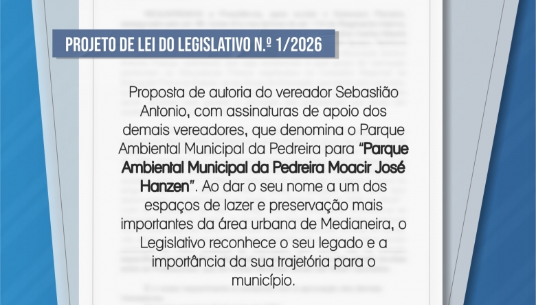 A Câmara aprovou nesta segunda-feira (23) o Projeto de Lei do Legislativo n.º 1/2026, que altera o nome do Parque Ambiental Municipal da Pedreira para “Parque Ambiental Municipal da Pedreira Moacir José Hanzen”. A proposta, de autoria do vereador Sebastião Antonio com apoio unânime dos demais vereadores, oficializa uma justa homenagem ao relevante legado social, cultural e econômico deixado por Moacir no município.