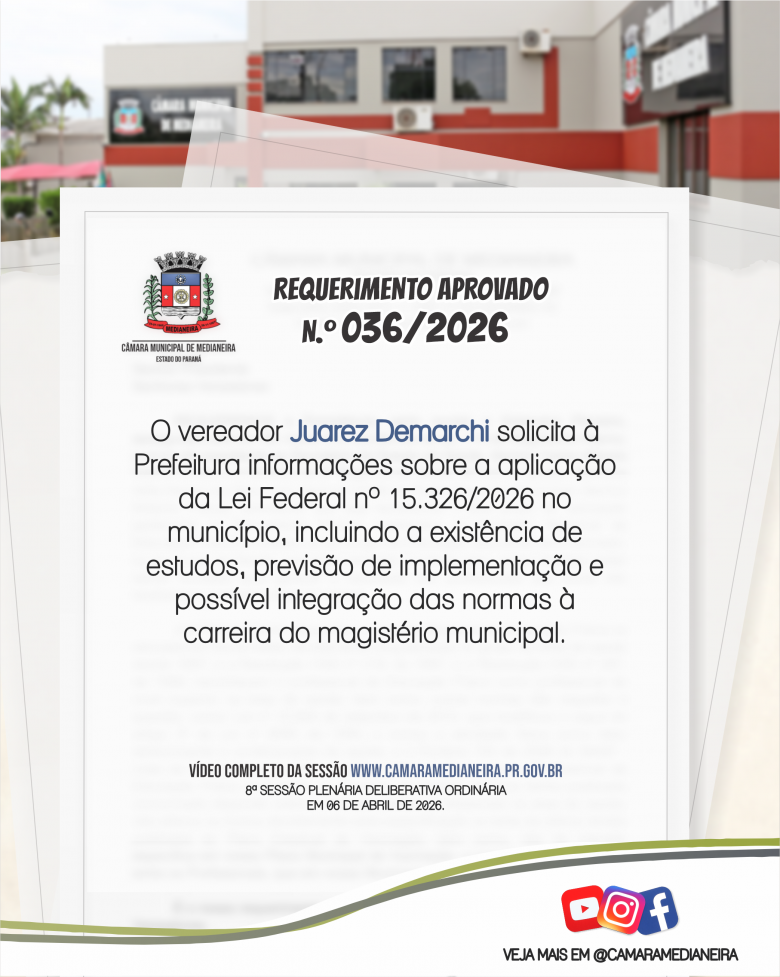 Requerimentos de autoria dos vereadores aprovados nesta semana. Para mais informações acesse o site. www.camaramedianeira.pr.gov.br