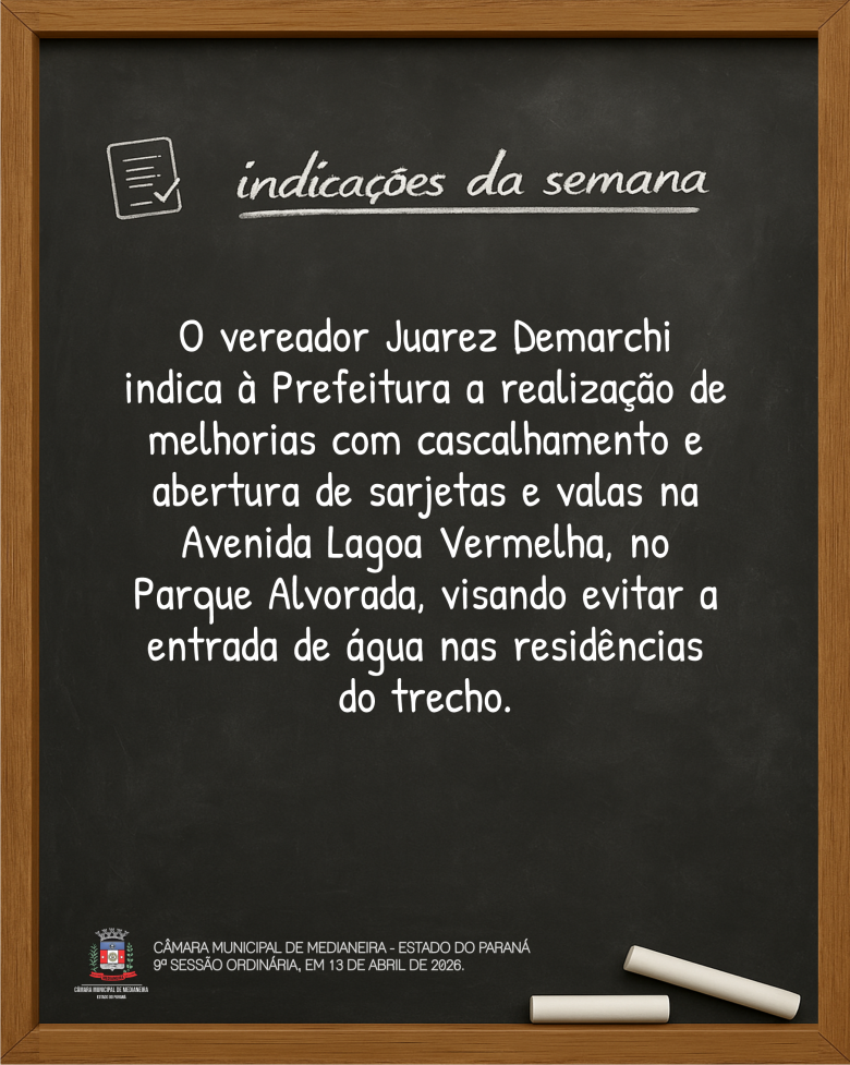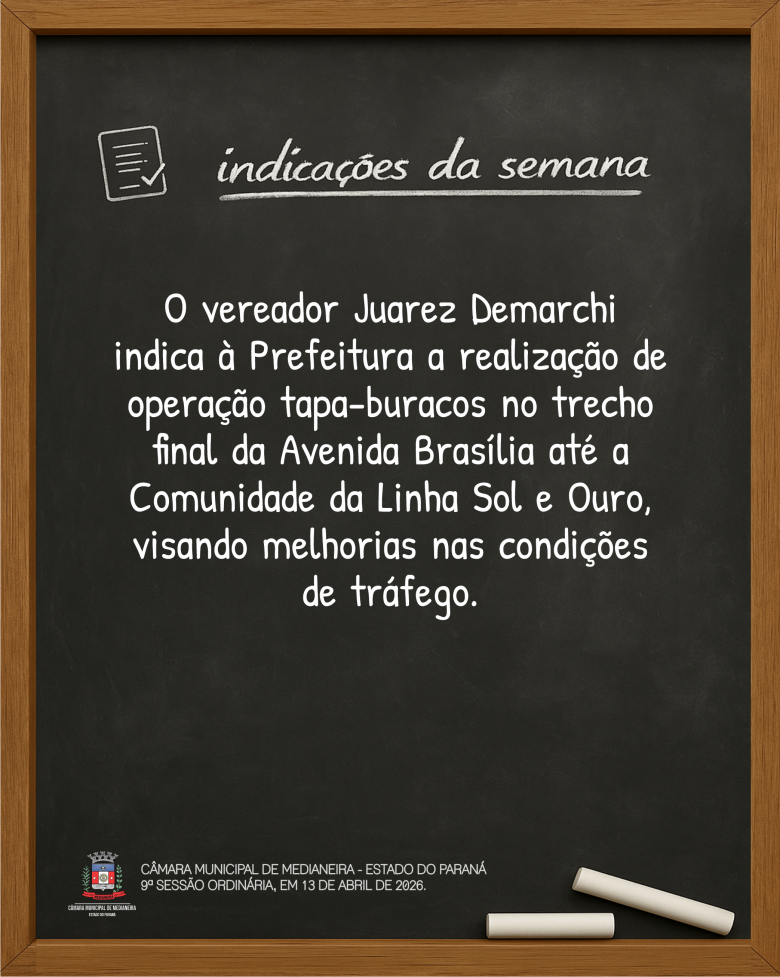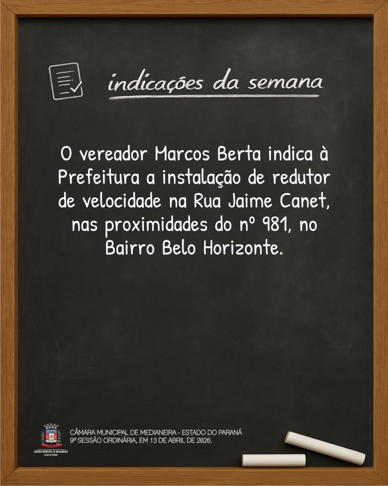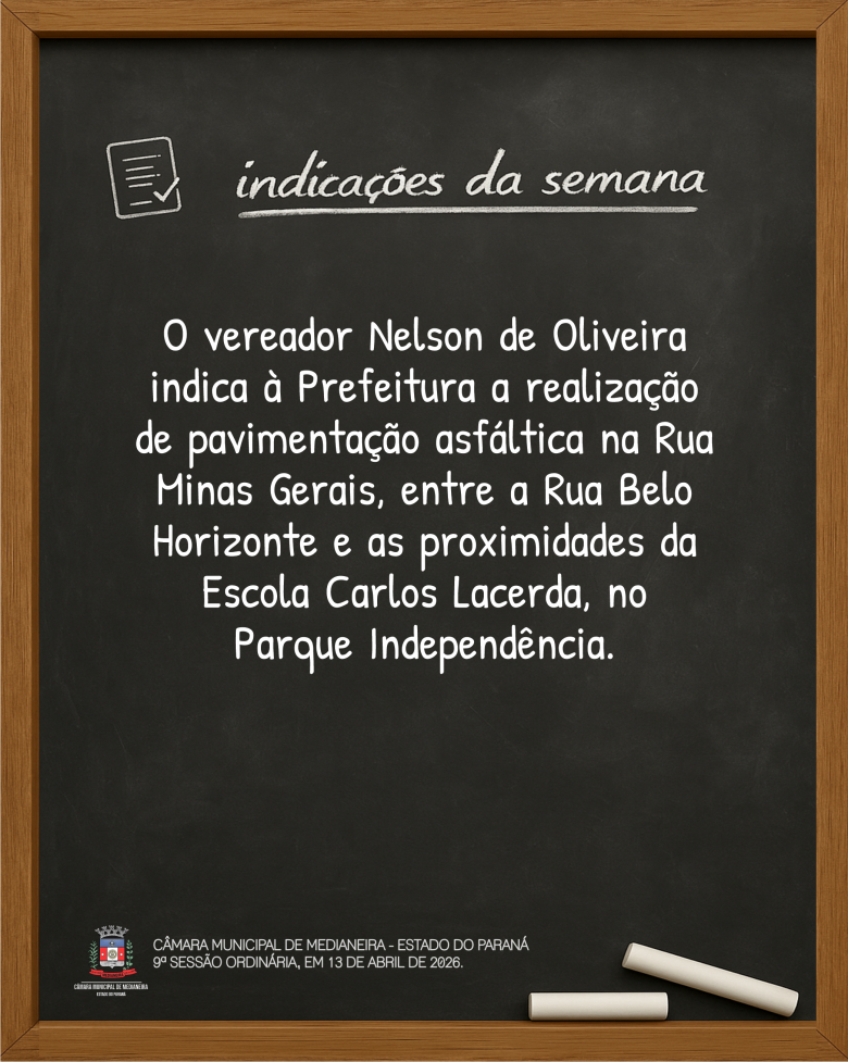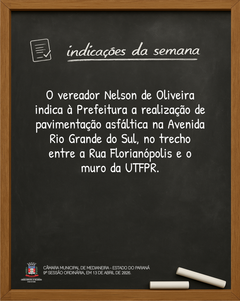 Indicações da 9ª Sessão Ordinária, realizada em 13 de abril de 2026. Mais detalhes sobre a sessão no site www.camaramedianeira.pr.gov.br.