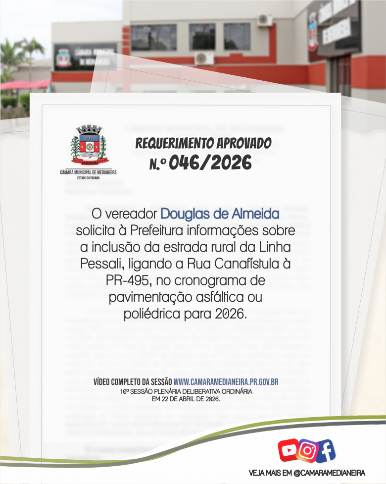 Requerimentos de autoria dos vereadores aprovados nesta semana. Para mais informações acesse o site. www.camaramedianeira.pr.gov.br